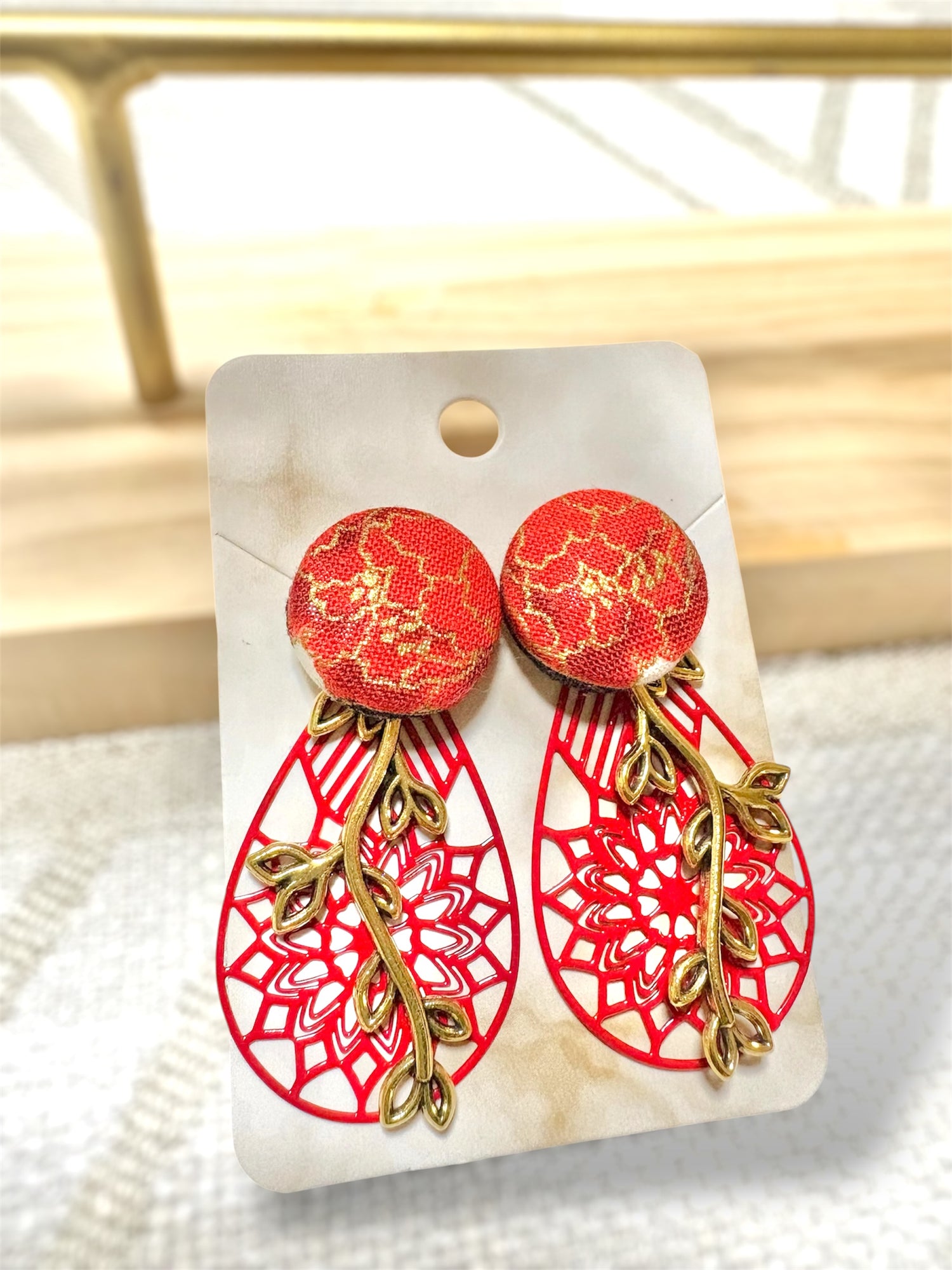 #811/ 発送7日以内 4way◆和モダンピアス 牡丹 赤 金彩くるみボタン 金属アレルギー対応 和柄 和風 着物 Kimono Japan