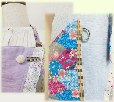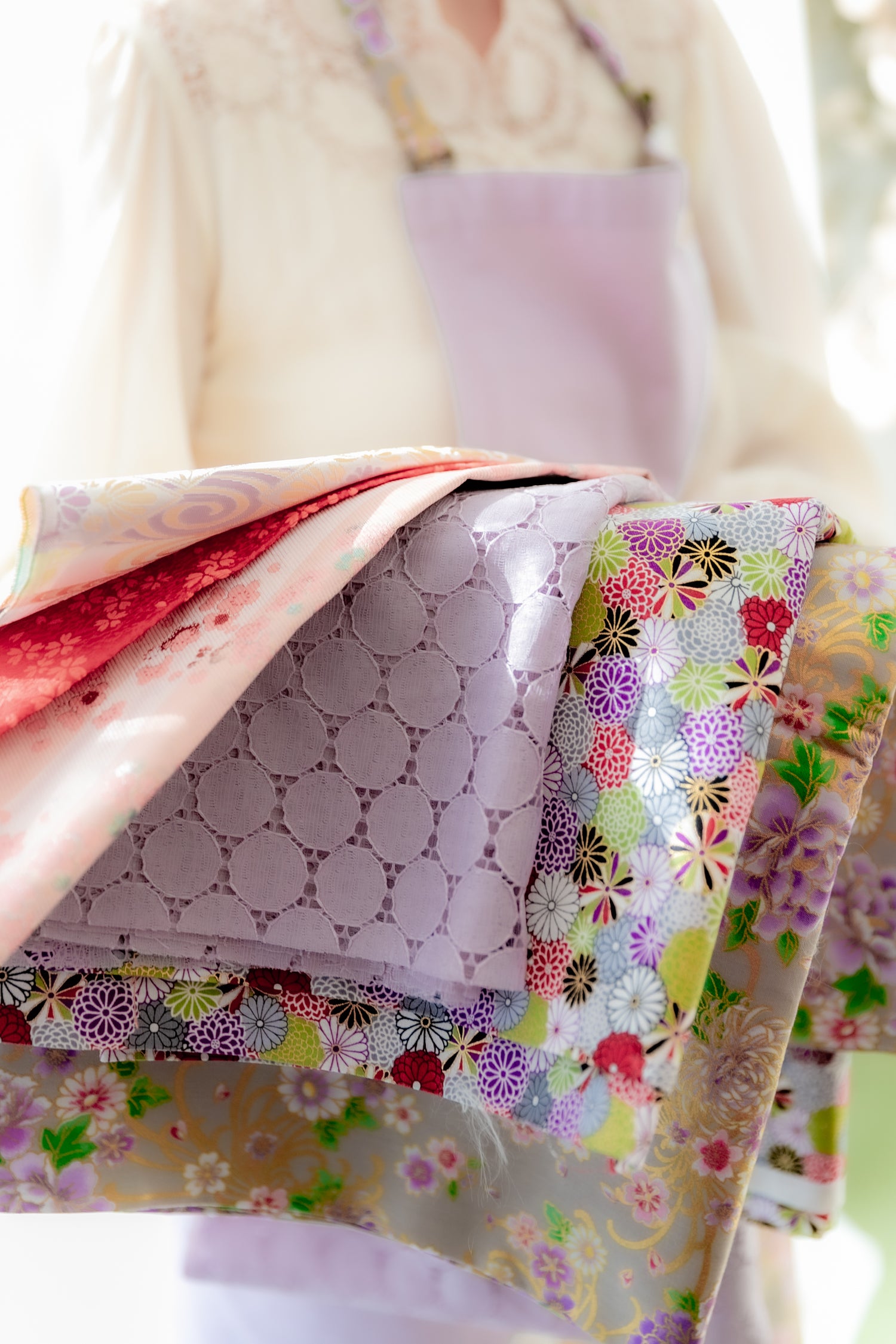 2つの布地の間に、伊達襟に見立てた円や葉模様のレースなどを配置。異なる色味を調和させたり、反対にアクセントカラーとして、その一枚の個性を際立たせます。豊かな和の色彩を感じられます。