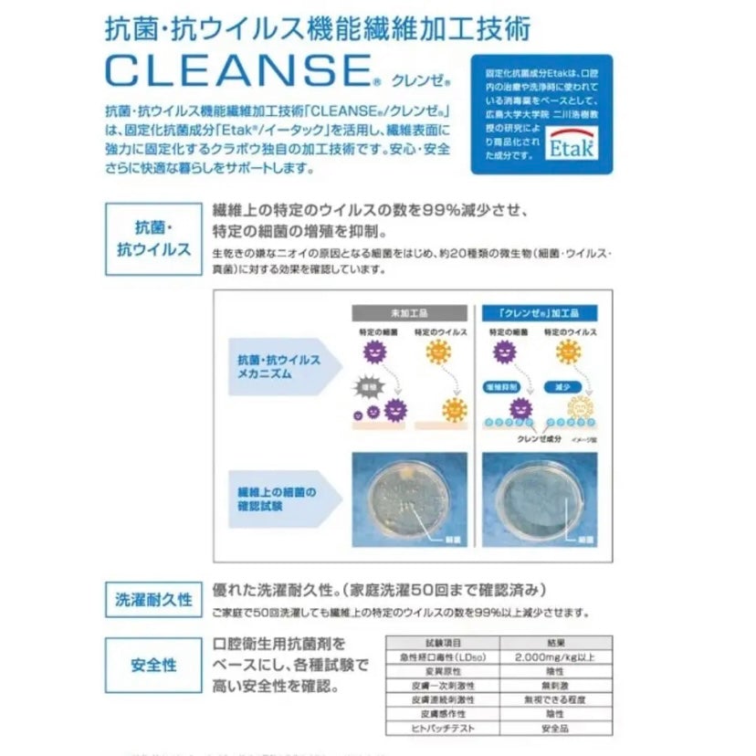 ⚫︎抗菌・抗ウイルス機能繊維加工技術「CLEANSE®/クレンゼ®」は、固定化抗菌成分「Etak®/イータック」を活用し、繊維表面に強力に固定化するクラボウ独自の加工技術です。安心・安全さらに快適な暮らしをサポートします。