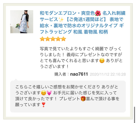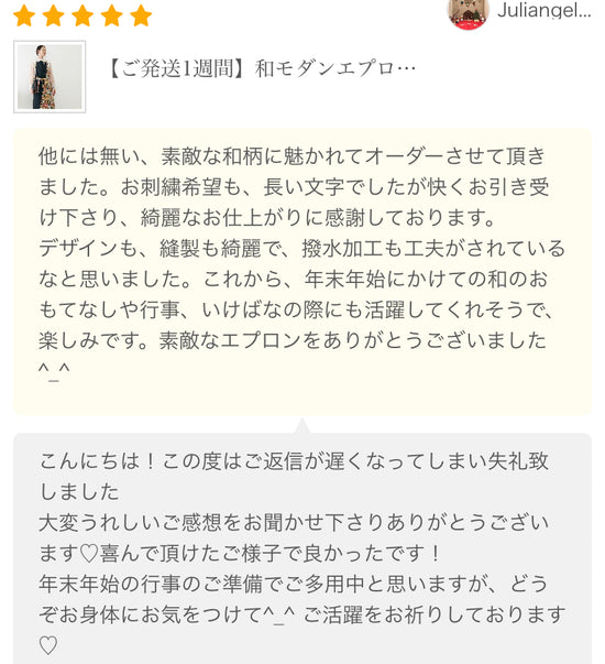 「お料理でもてなす機会が多いので、気分が上がるエプロンはうれしい」