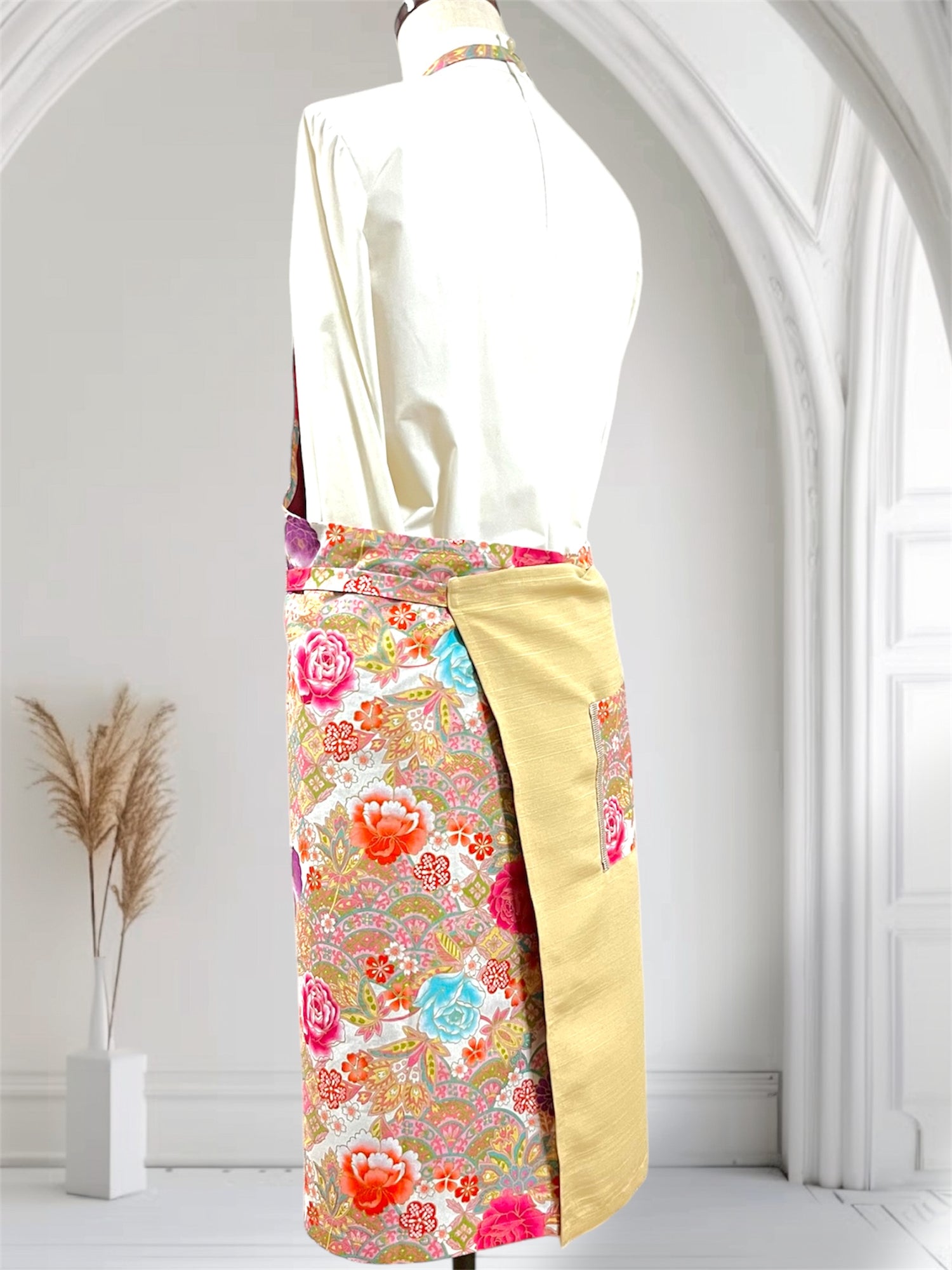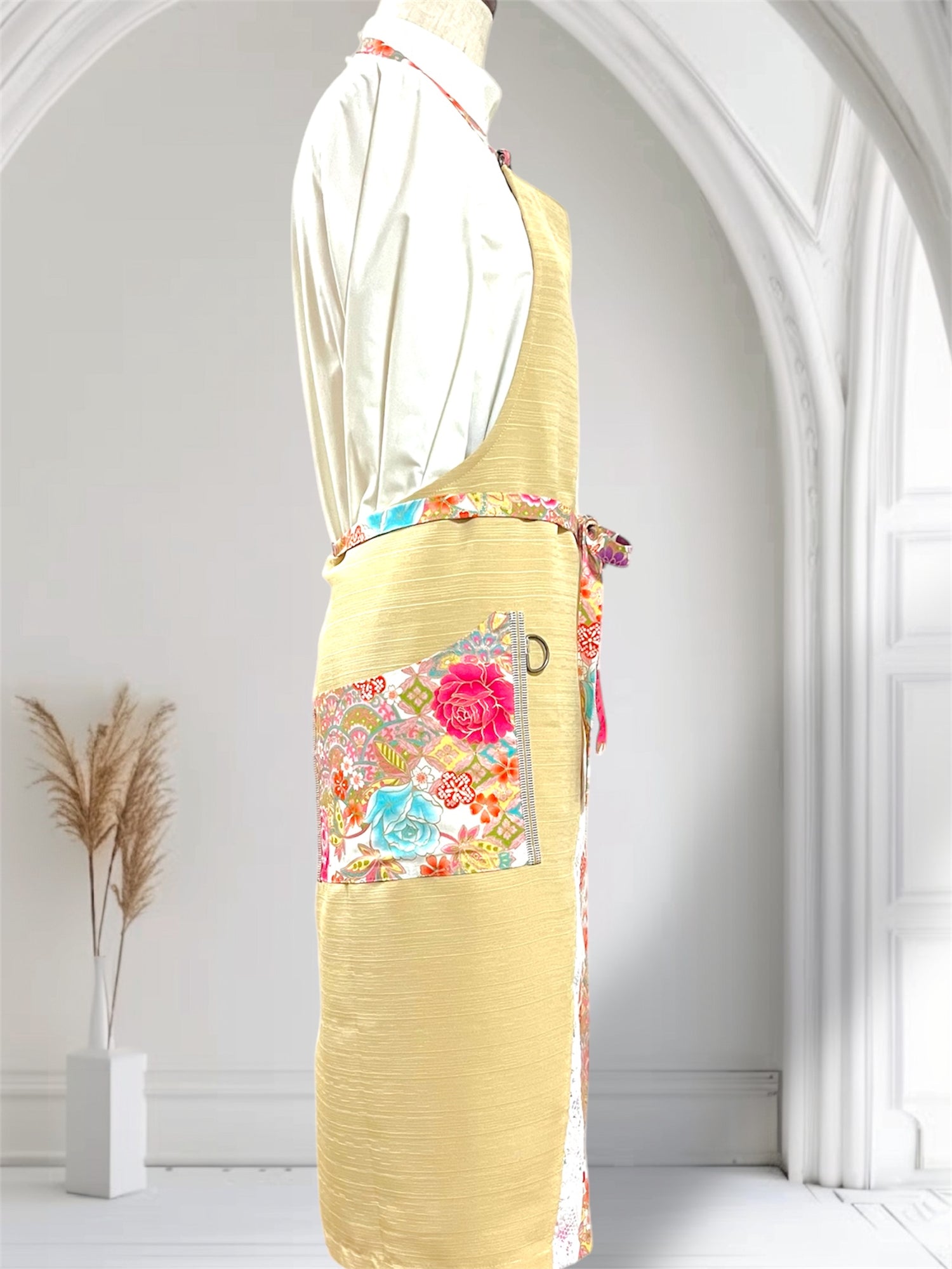 #218/発送30日以内 薄黄色と花爛漫文様 ぬれんがね 和モダンエプロン 紬クロス 綿素材プリント NURENGANE Japanese modern ,KIMONO pattern apron