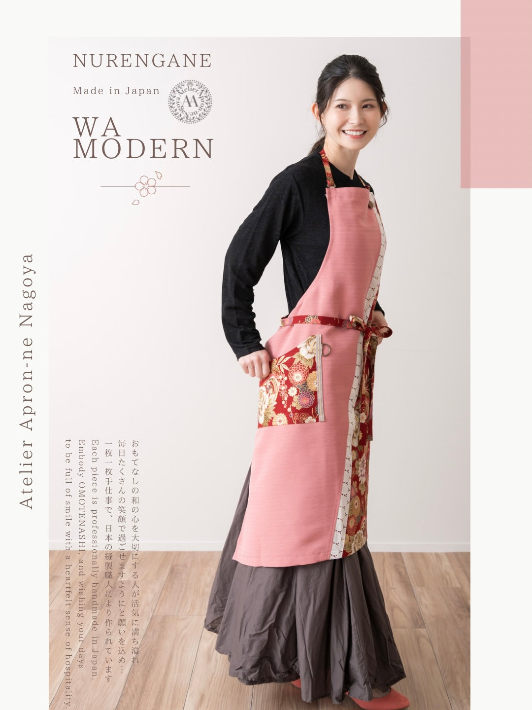 #111/発送3日以内 桃色と牡丹文様 ぬれんがね 和モダンエプロン 紬クロス 綿素材プリント カフェ レストラン ユニフォーム 旅館 和風NURENGANE Japanese modern ,KIMONO pattern apron