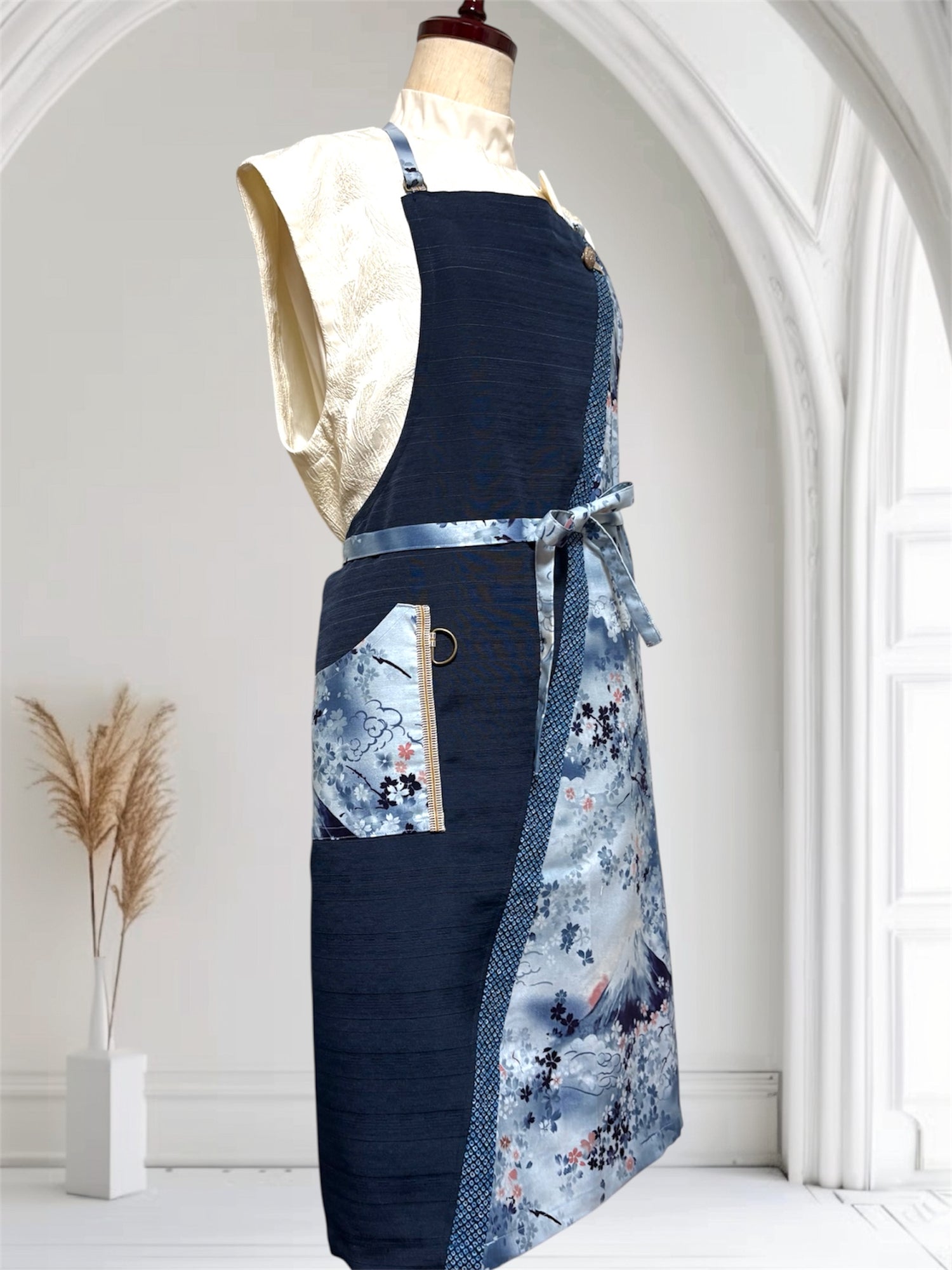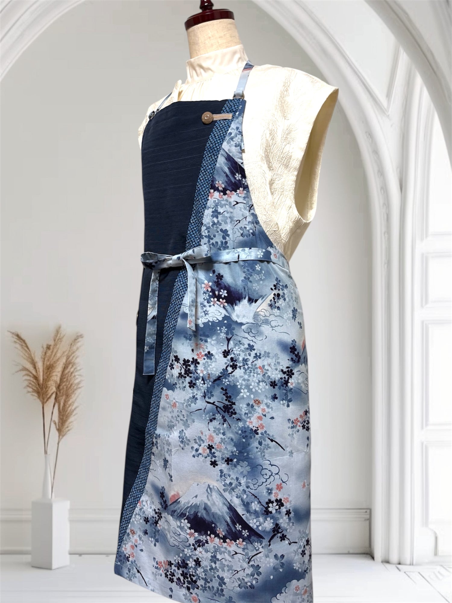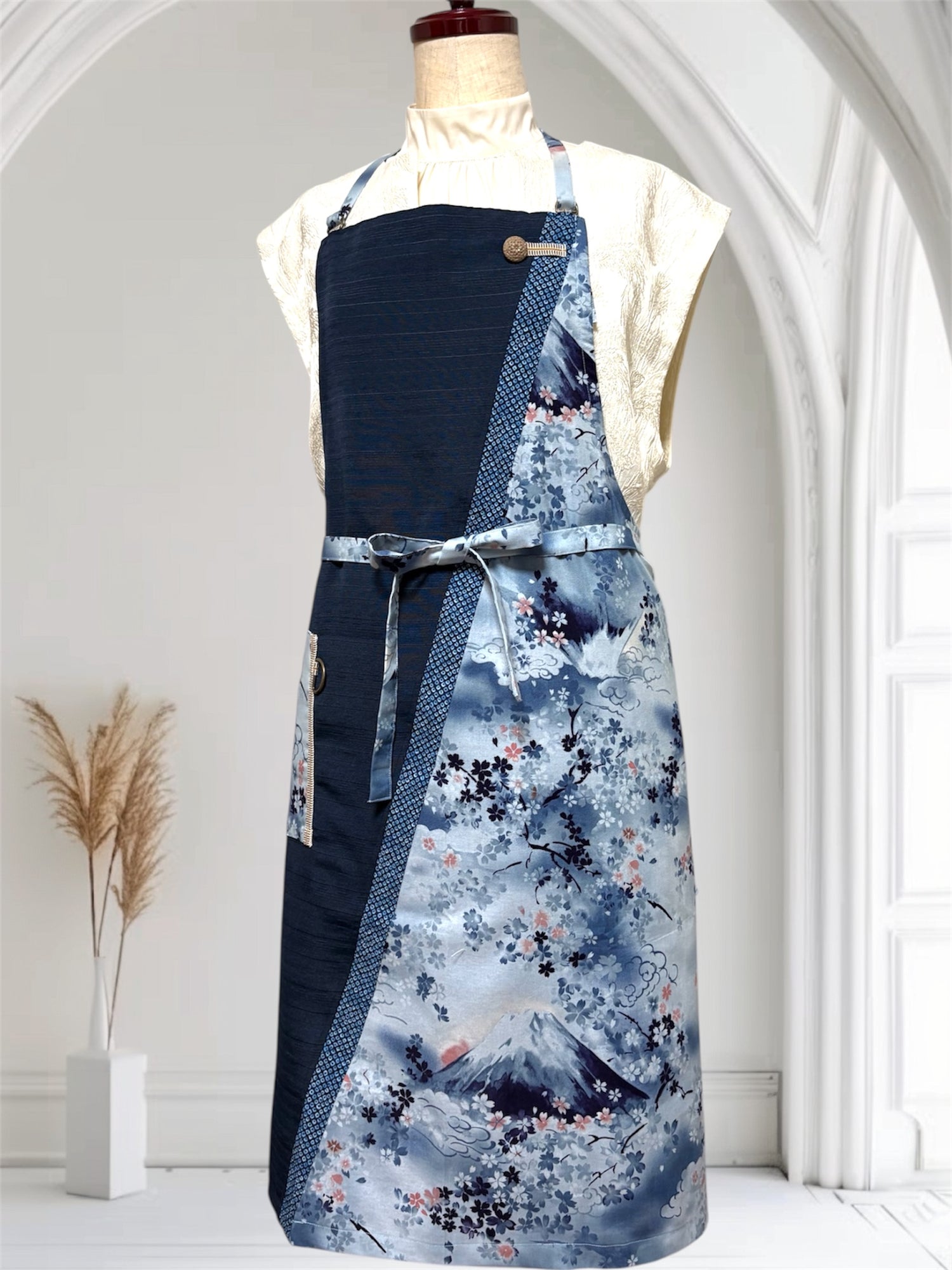 #211/発送3日以内【一点物】紺色と富士山 ぬれんがね 和モダンエプロン 紬クロス 綿素材プリント カフェ レストラン ユニフォーム 旅館 和風