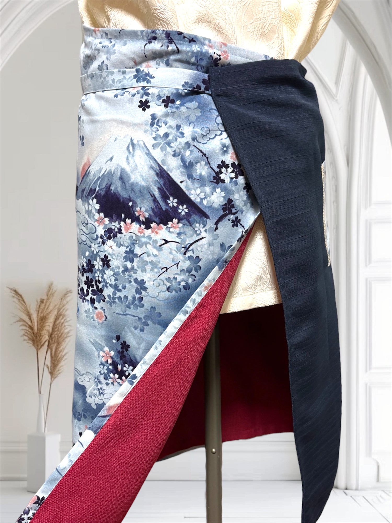 無地と和柄のふたつの布地を用いて、大胆にいれた斜めも切り替え線をいれました。