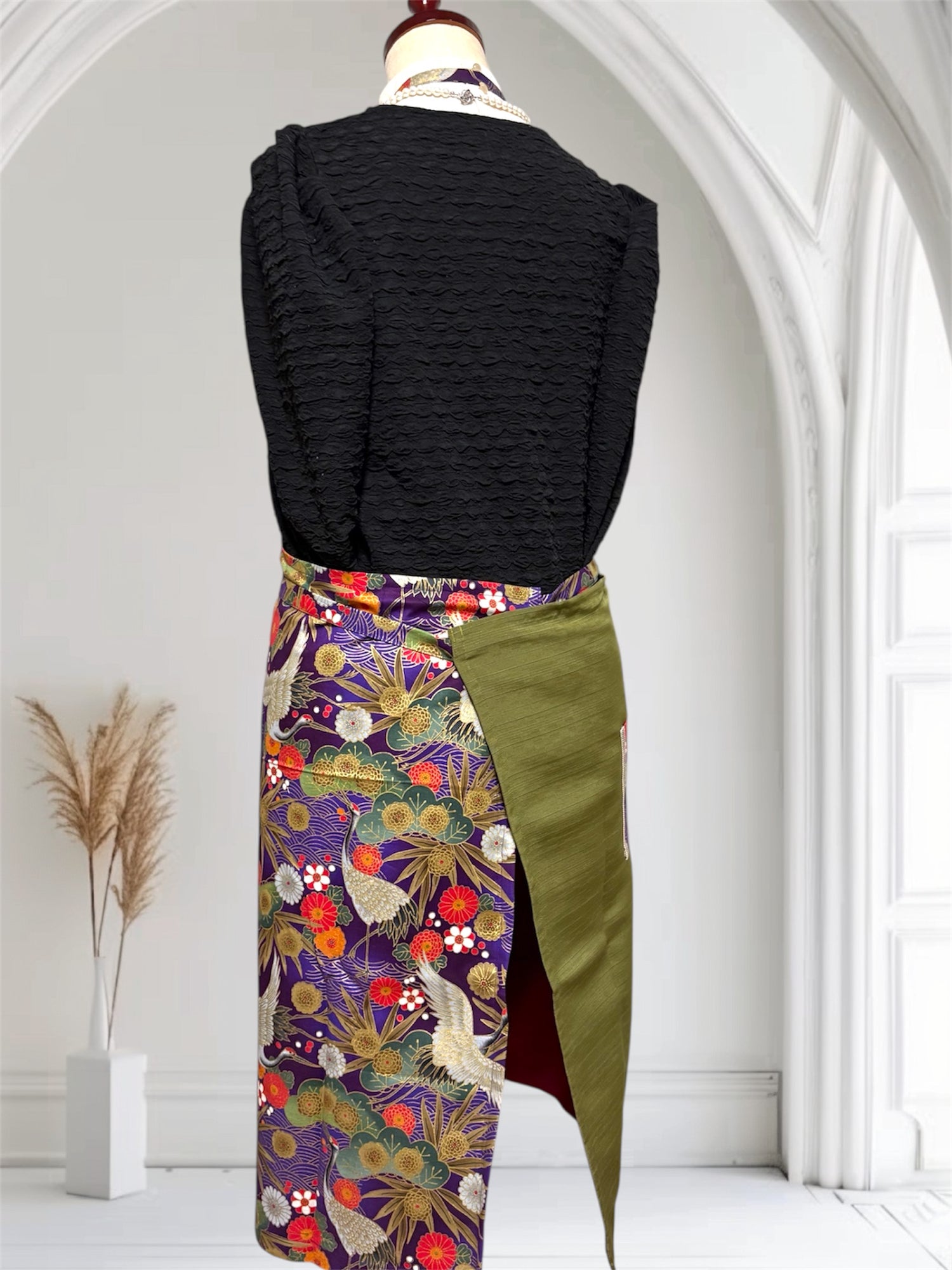 無地と和柄のふたつの布地を用いて、大胆にいれた斜めも切り替え線をいれました。