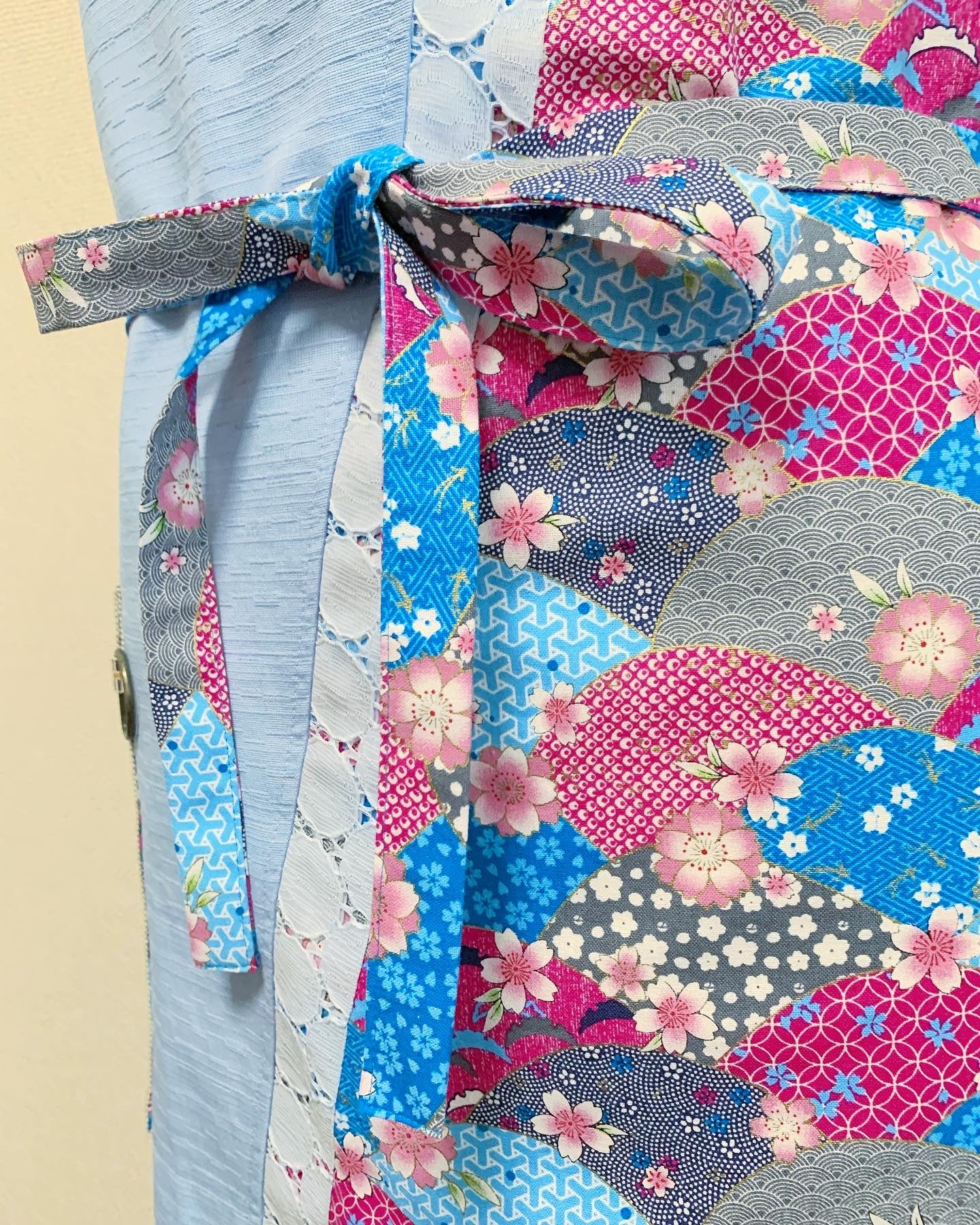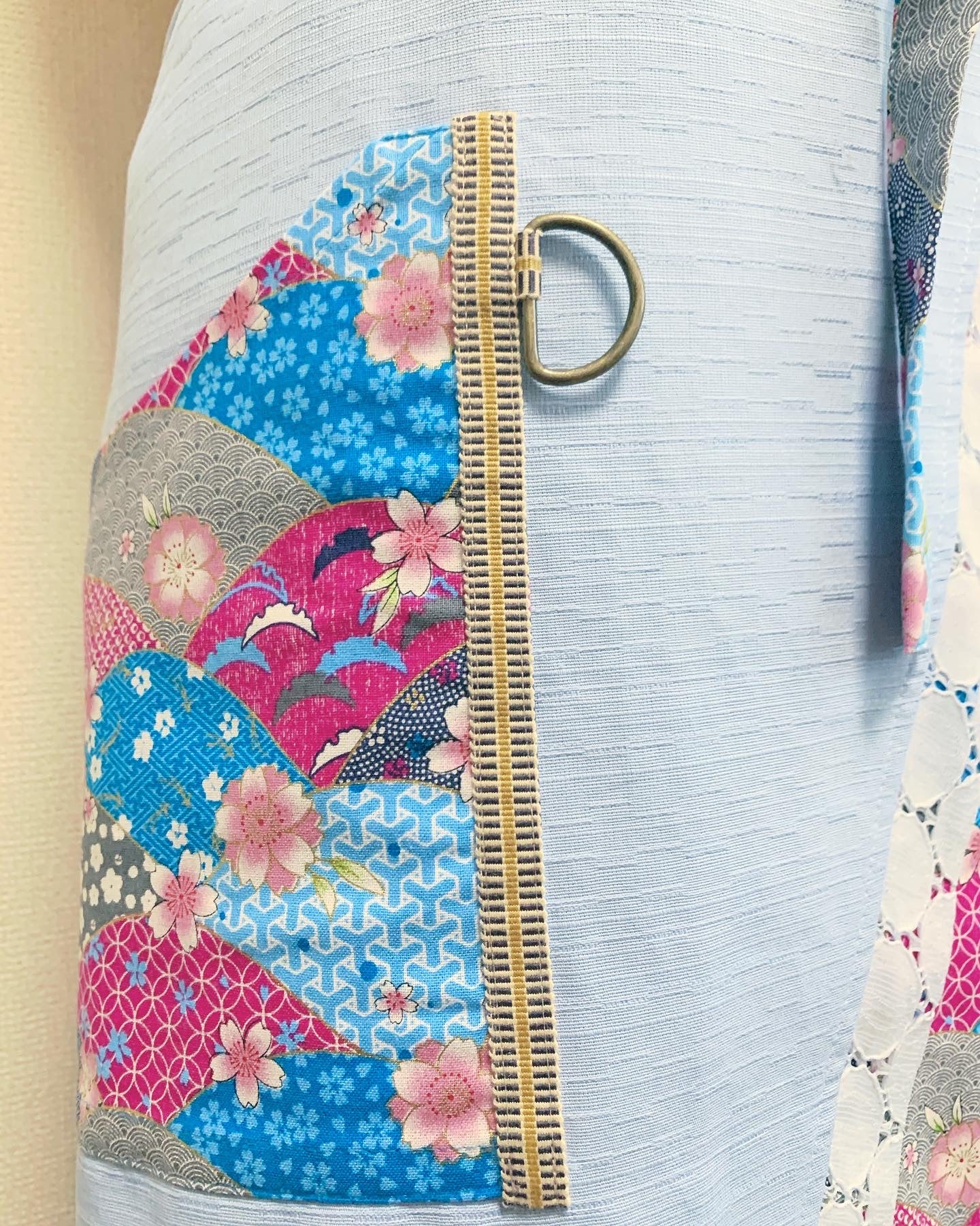 無地と和柄のふたつの布地を用いて、大胆にいれた斜めも切り替え線をいれました。
