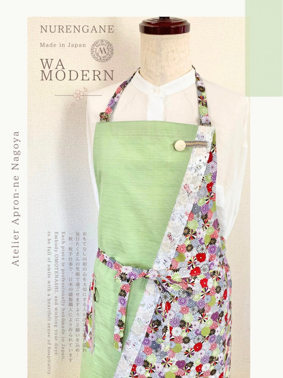 #212/ 発送3日以内【一点物】薄緑と菊紋様 ぬれんがね 和モダンエプロン 紬クロス 綿素材プリント カフェ レストラン ユニフォーム 旅館 和風 NURENGANE Japanese modern ,KIMONO pattern apron