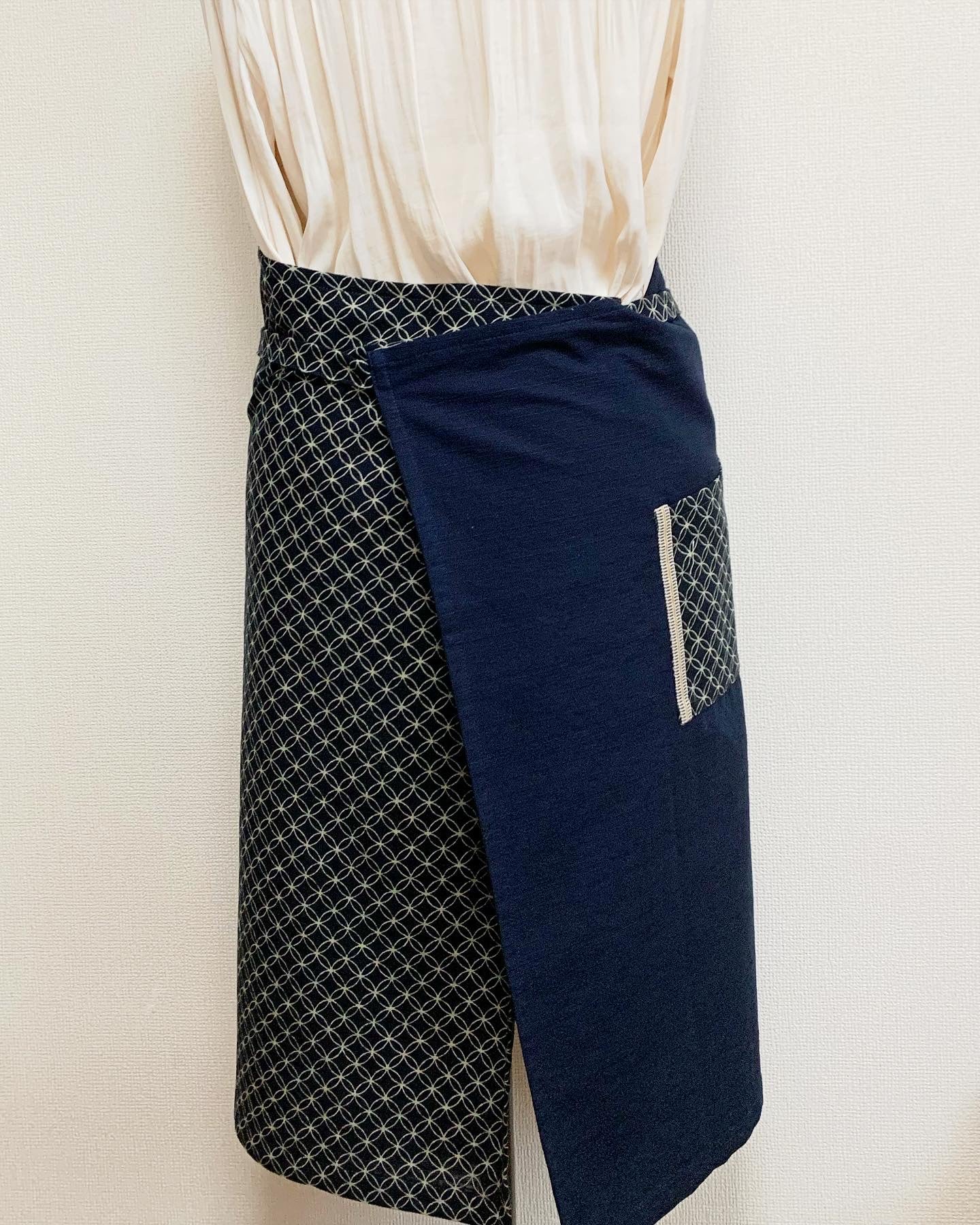無地と和柄のふたつの布地を用いて、大胆にいれた斜めも切り替え線をいれました。