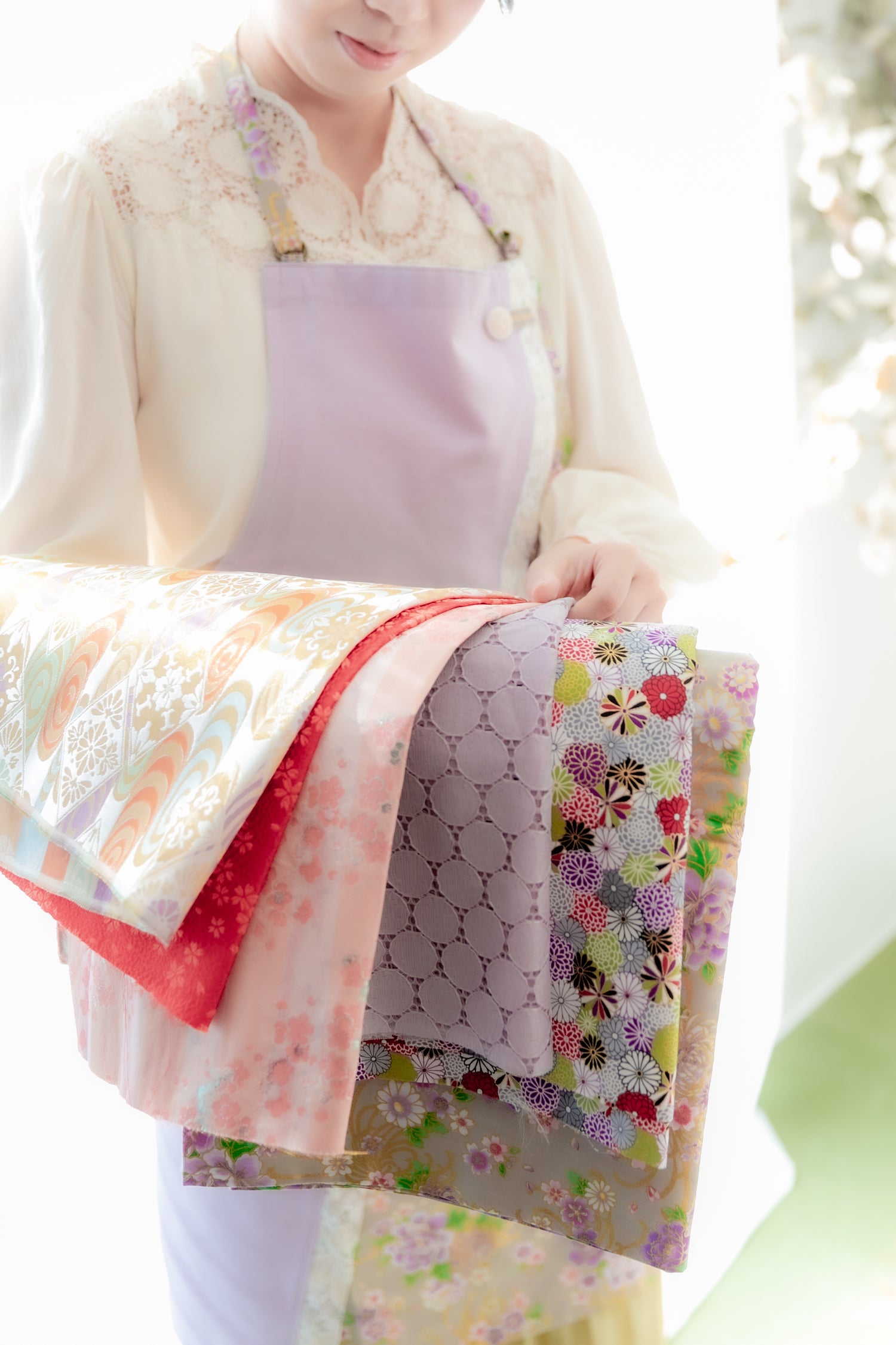異なる色味の布地を調和させたり、反対にアクセントカラーとして個性を際立たせたりと、着物の豊かな配色を感じられるように。