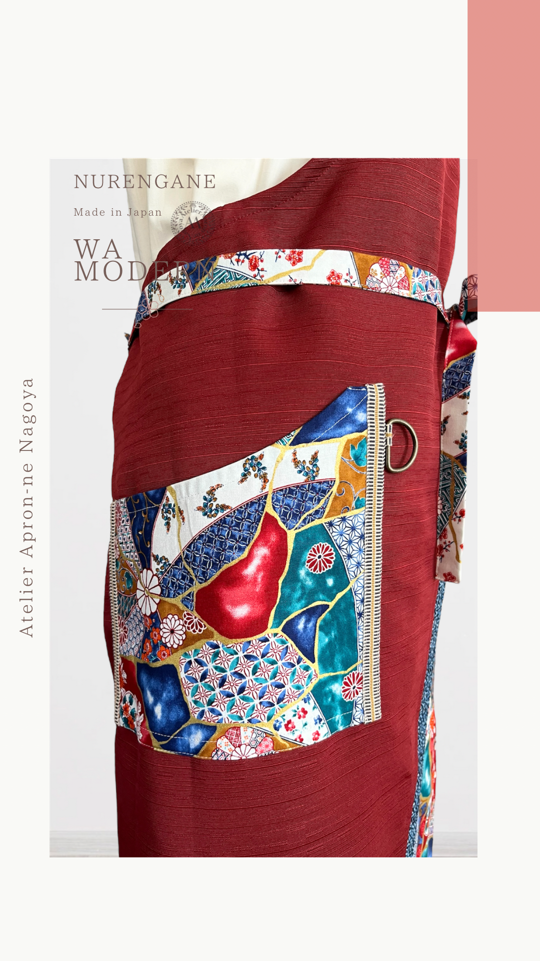 #403/発送7日以内 茜色と金継ぎ文様 ぬれんがね 和モダンエプロン 紬クロス 綿素材プリント