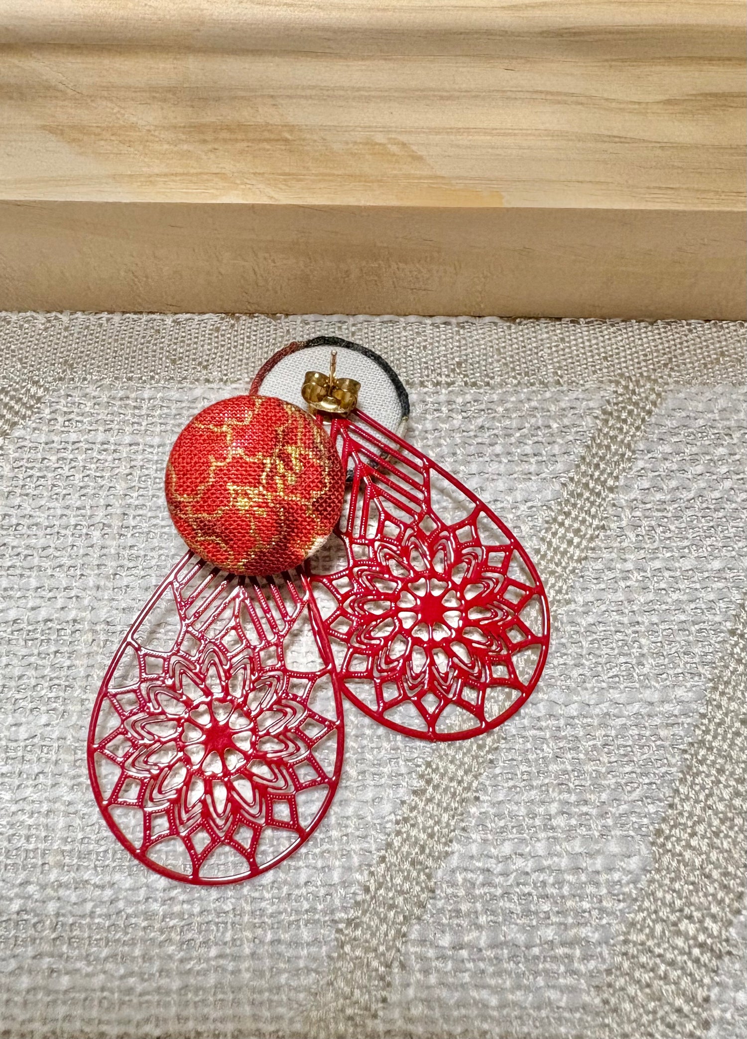 #811/ 発送7日以内 4way◆和モダンピアス 牡丹 赤 金彩くるみボタン 金属アレルギー対応 和柄 和風 着物 Kimono Japan