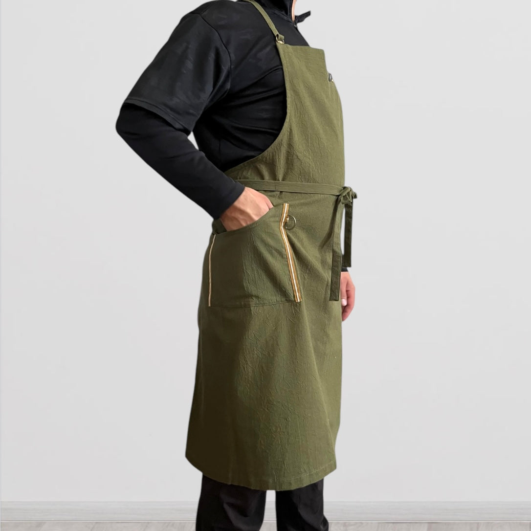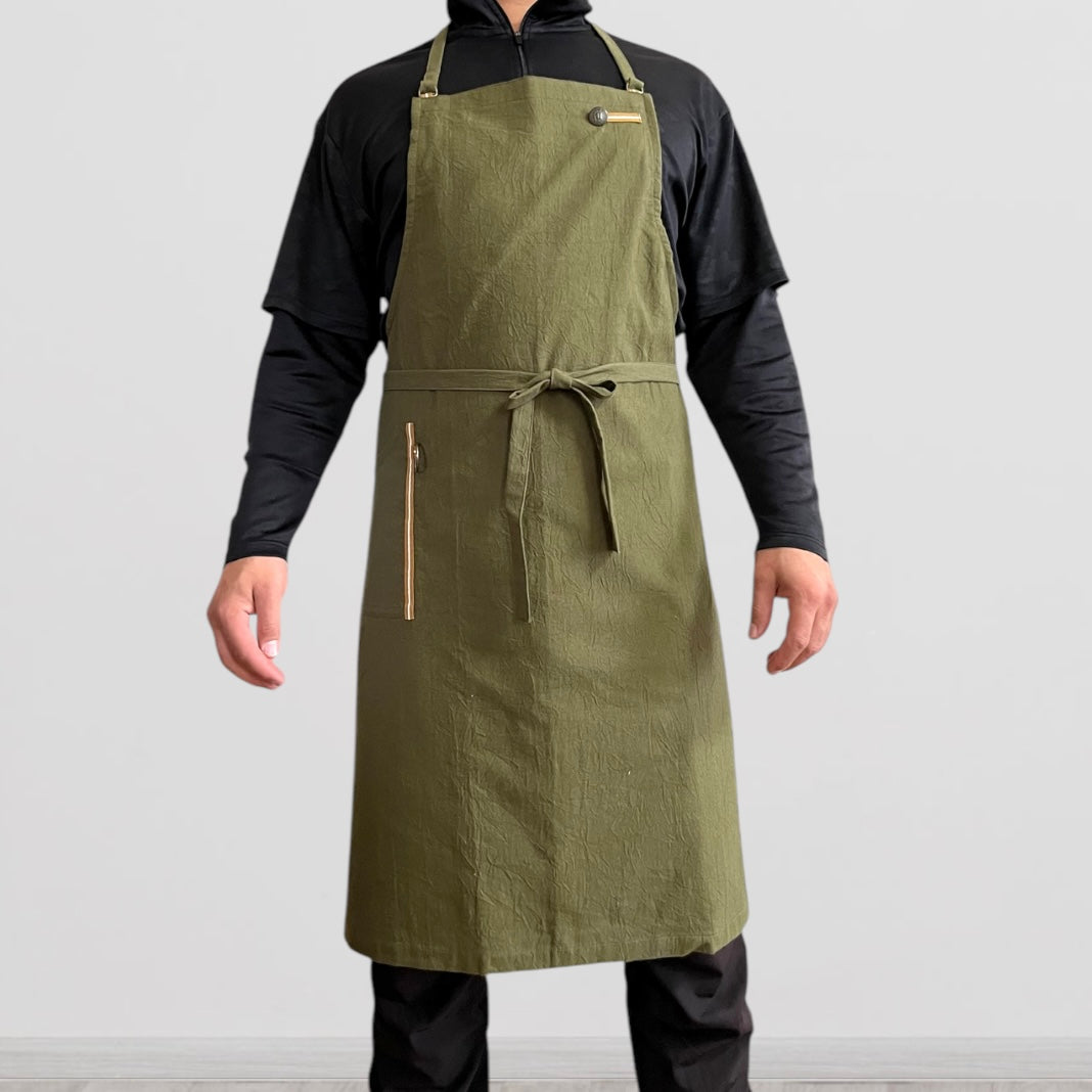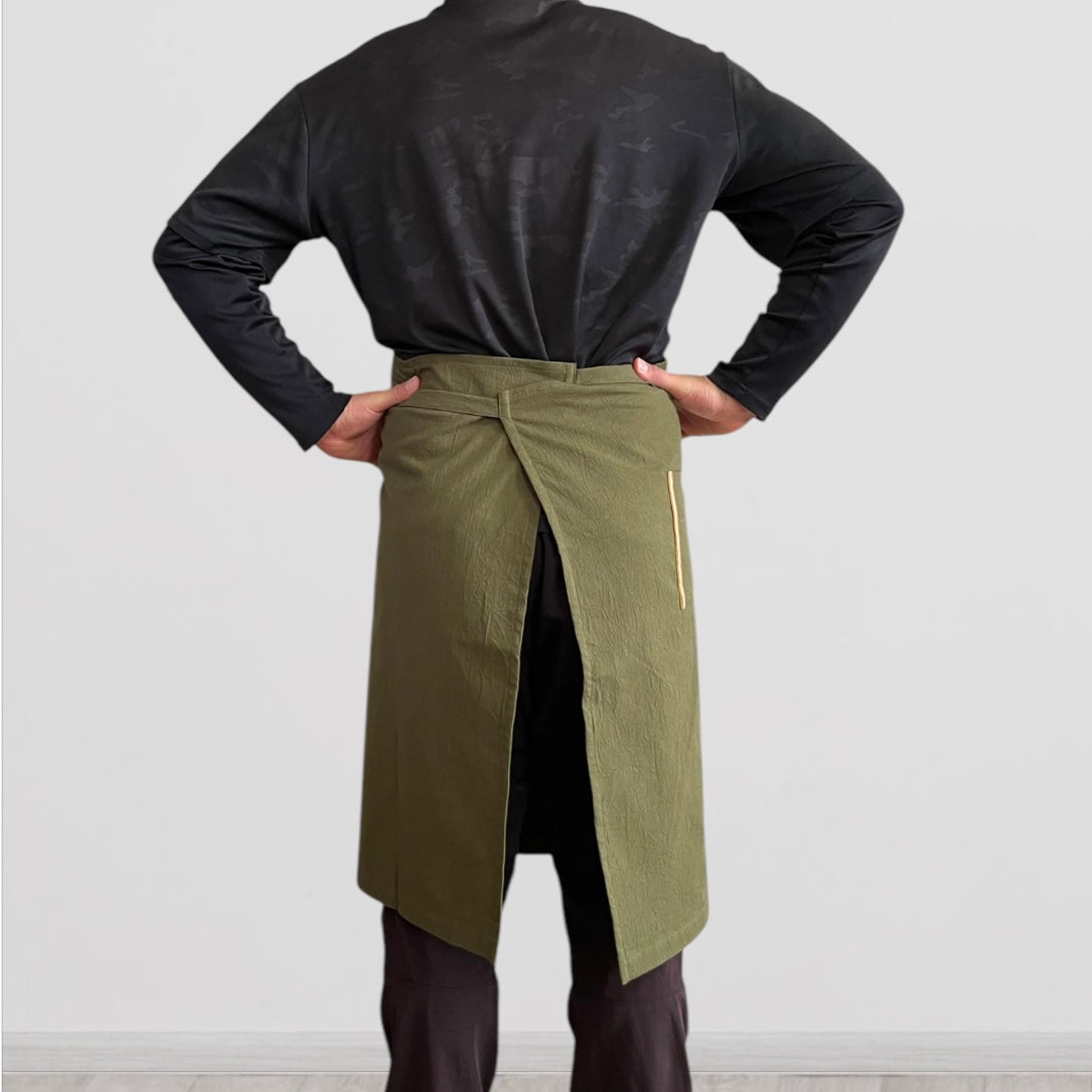 #0042 発送3日以内 カーキ メンズ着用イメージ/ ぬれんがね ベーシック 表地で吸水、裏地で水から守るエプロン 手もみ風コットン布地 NURENGANE BASIC apron