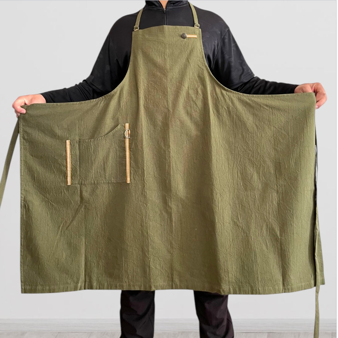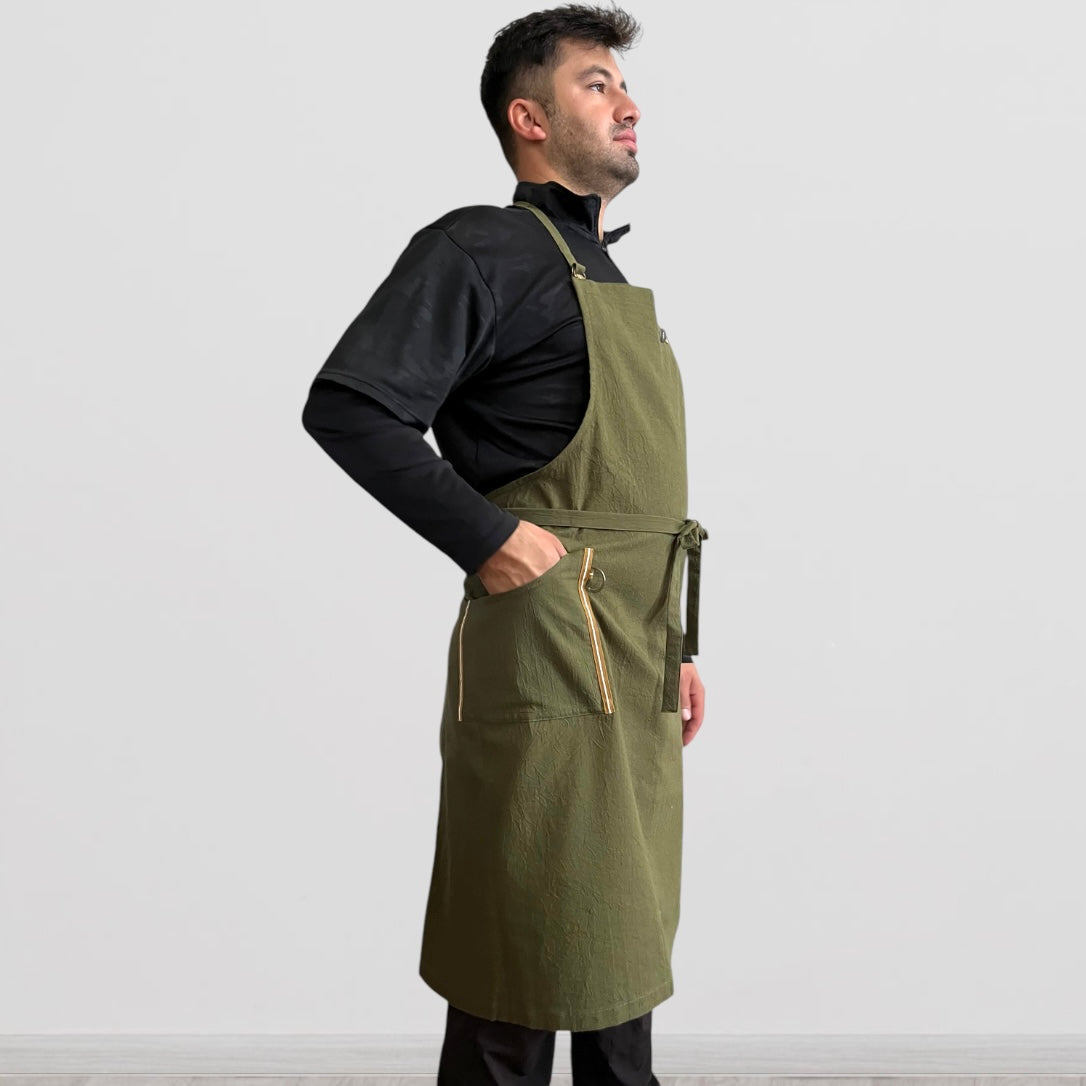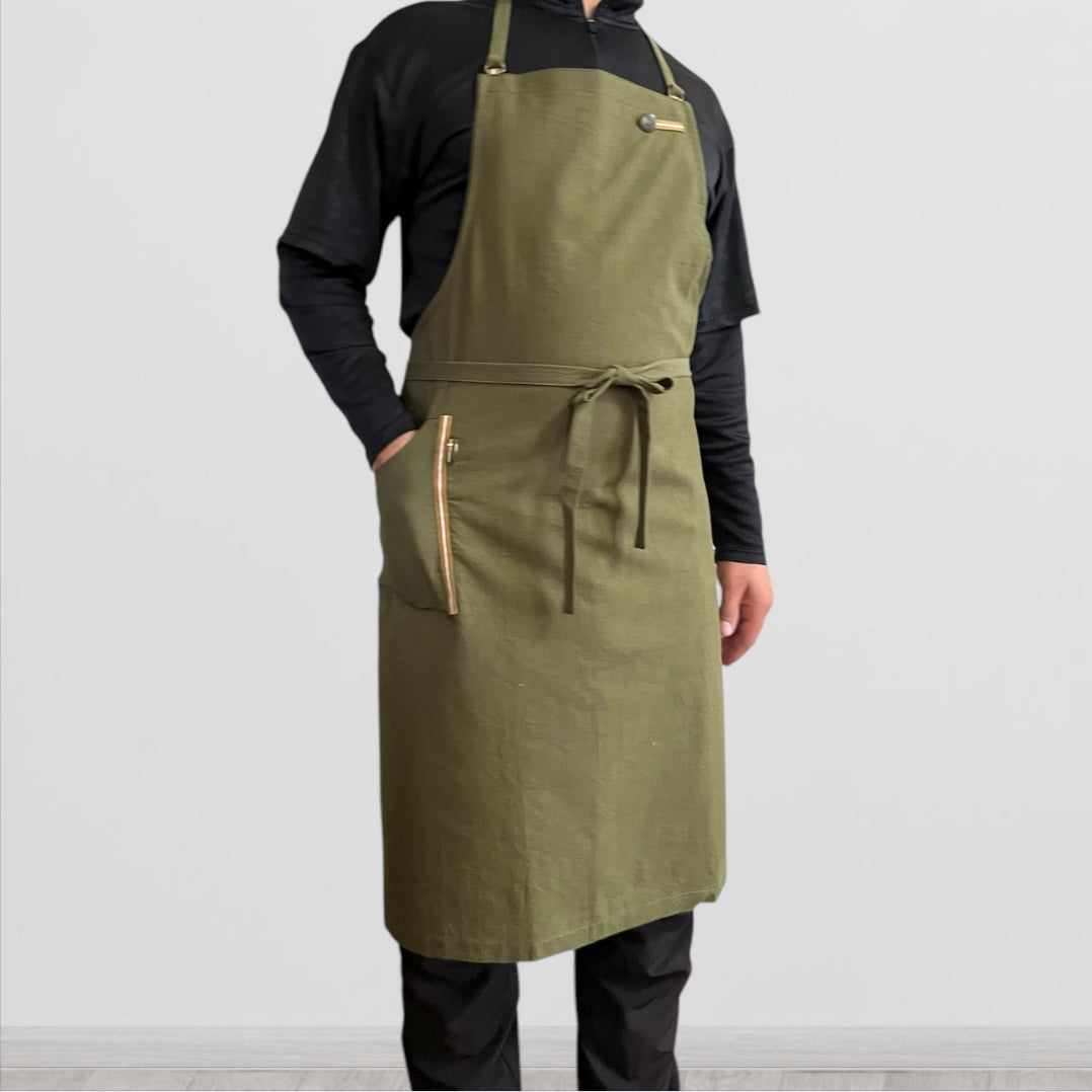 #0042 発送3日以内 カーキ メンズ着用イメージ/ ぬれんがね ベーシック 表地で吸水、裏地で水から守るエプロン 手もみ風コットン布地 NURENGANE BASIC apron