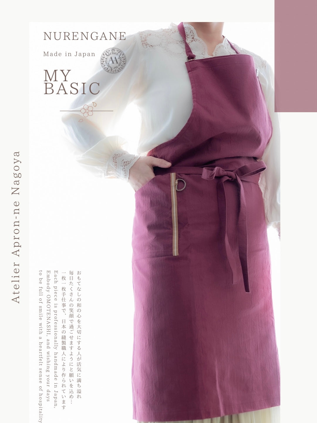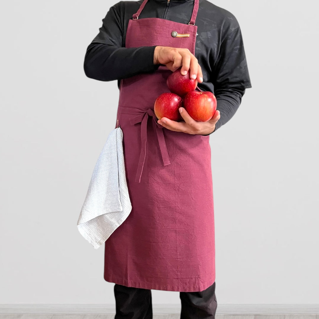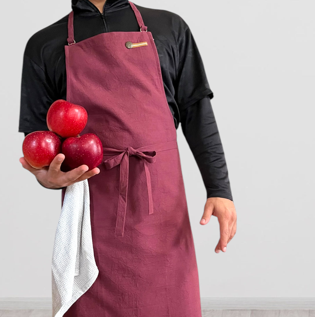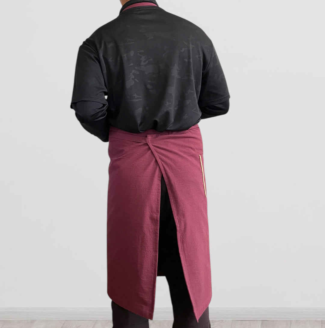 #0072 ワインレッド メンズ着用イメージ/ ぬれんがね ベーシック 表地で吸水、裏地で水から守るエプロン 手もみ風コットン布地 NURENGANE BASIC apron