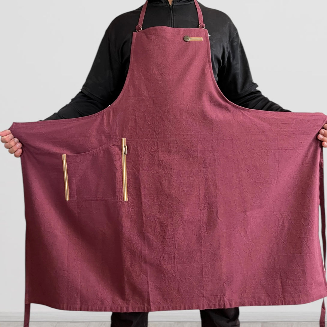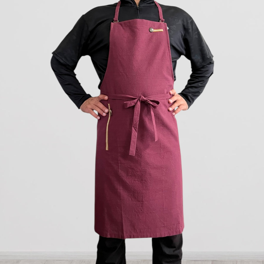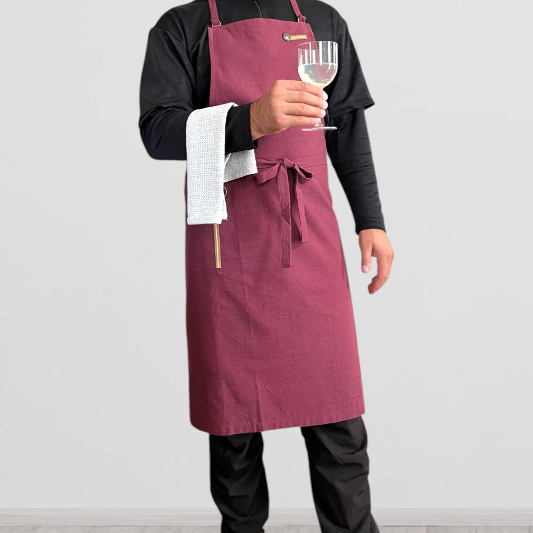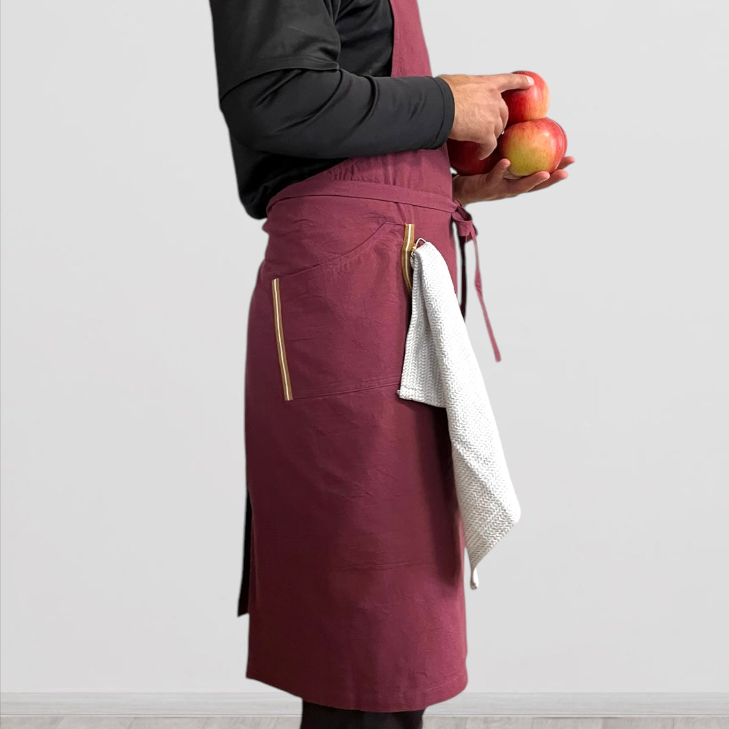 #0072 ワインレッド メンズ着用イメージ/ ぬれんがね ベーシック 表地で吸水、裏地で水から守るエプロン 手もみ風コットン布地 NURENGANE BASIC apron